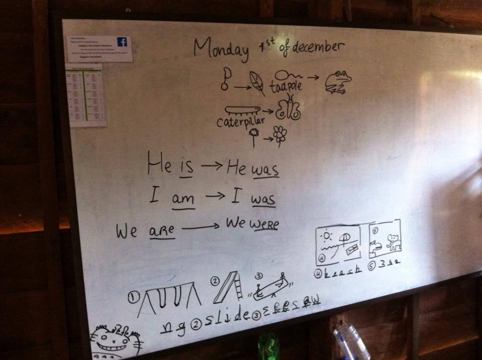 Ik ben nu in Cambodja. Gemiddeld 31 °C, dus douchen kan je de hele dag door. Ik geef Engels op een klein schooltje bestaande uit anderhalf klaslokaal, Angkor Tree School genaamd. ’s Ochtends hebben we 50 leerlingen, ’s middags iets minder. Het dorpje ligt op een paar kilometer van Siem Reap en Angkor Wat, dat bekend is om z’n prachtige Khmer tempels. Behalve dat ik lesgeef leer ik zelf ontzettend veel over de Cambodjaanse cultuur. Ik denk dat vrijwilligerswerk doen de beste manier is om met locals in contact te komen. Twee keer per dag ben ik bij Sokhom thuis: de oprichter, ‘directeur’ en enige leraar van de Angkor Tree School. We zitten dan op de grond met zijn vrouw, hun baby en soms ook wat leerlingen uit de buurt en eten rijst met soep en groenten. Sokhom vindt het geweldig om Engels te praten. Twee keer zijn we ’s avonds de stad ingegaan om iets te drinken in een cafeetje.