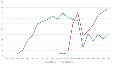 Tegelijk laat die ontwikkeling niet het hele verhaal zien. Uit de cijfers over 2025 blijkt dat er niet alleen een publiek is dat de bioscoop opzoekt voor een 3D-ervaring, maar dat het aandeel zelfs groeit. Mensen hebben daar bovendien meer geld voor over. De vraag naar film als belevenis is dus niet verdwenen, maar is verschoven naar een breder landschap van premium formats, zoals 4D en IMAX.